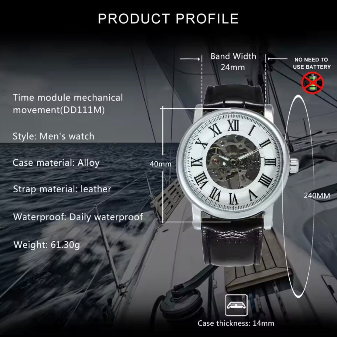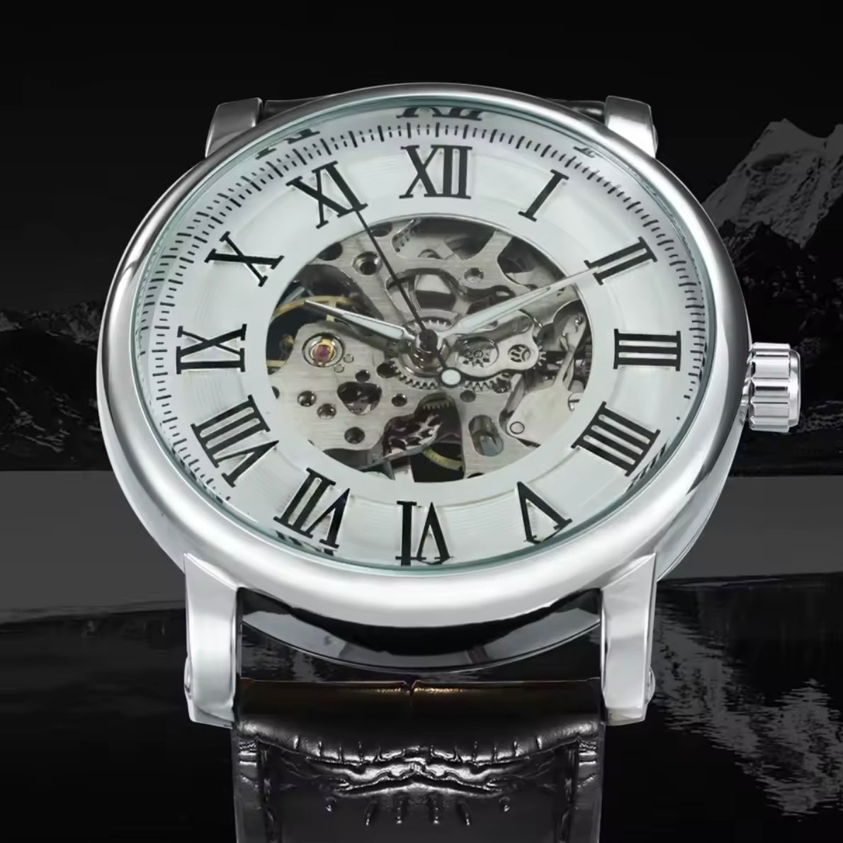 Stylish automatic mechanical skeleton watch with a classic Roman numeral dial.