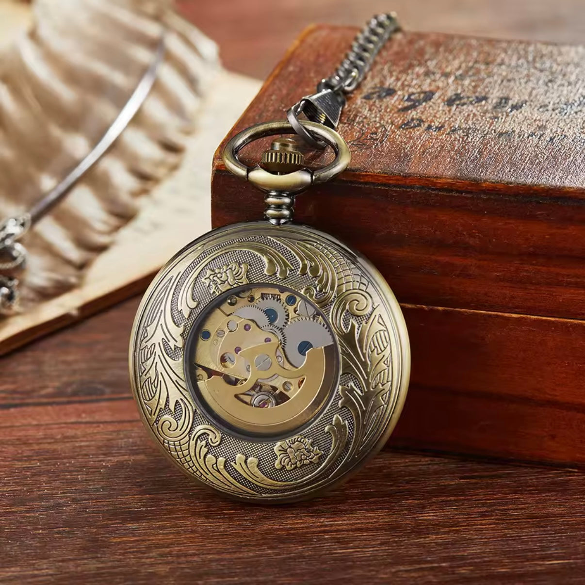 Bronze Skeleton Mechanical Pocket Watch – Hand Winding with See-Through Front & Back