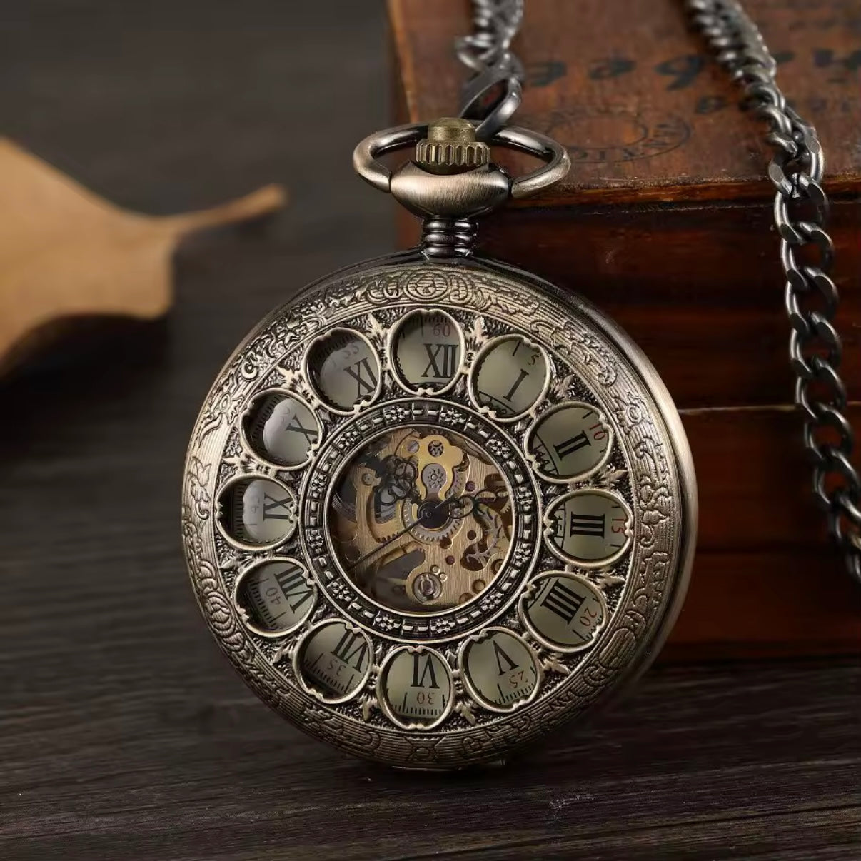 Antique Bronze Skeleton Pocket Watch – Mechanical Hand Winding with See-Through Back & Ornate Roman Dial